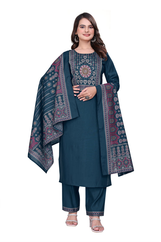 Designer 3 Piece Printed Salwar Suit Set – Teal Blue Kurta, Pant & Dupatta