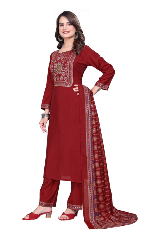 Designer 3 Piece Printed Salwar Suit Set – Deep Wine Red Tone Kurta, Pant & Dupatta