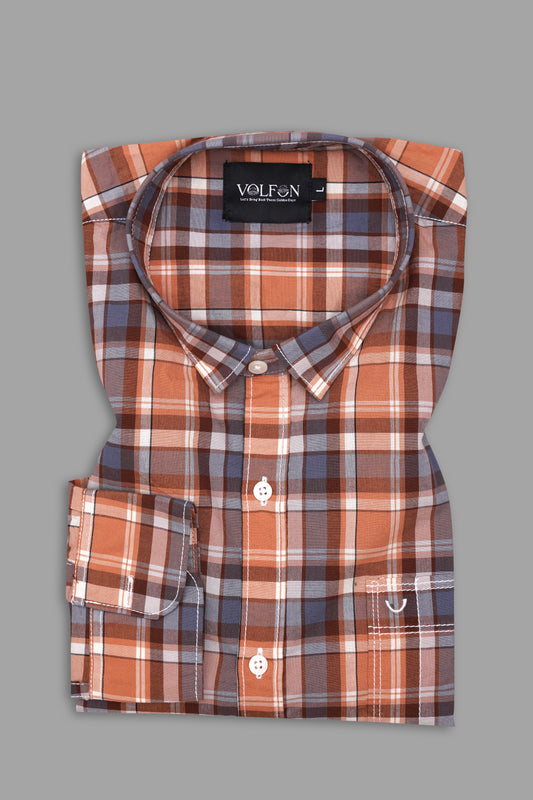BROWN WITH ORANGE POPLIN CHECKS PREMIUM COTTON SHIRT